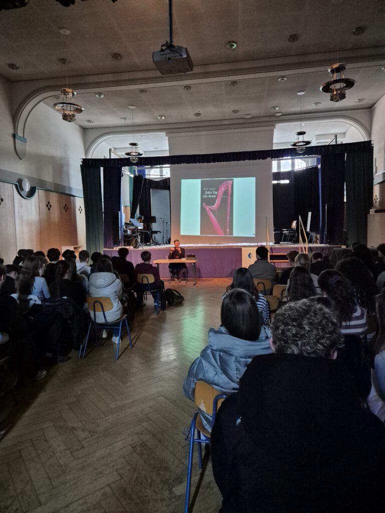 Ron Segal stammt ursprünglich aus Israel, lebt aber seit mehr als 10 Jahren in Berlin. Auch seine Großmutter lebte in Berlin, bis sie vor der Verfolgung durch das Nazi-Regime flüchten musste. Deutschland hat für ihn daher auch eine familiäre Bedeutung. Die Zehntklässler und Zehntklässlerinnen lauschten gebannt seiner Lesung aus dem Roman „Jeder Tag wie heute“, in dem er auf Basis seiner Recherchearbeit die Geschichte des KZ-Überlebenden Adam Schuhmacher und dessen Frau Bella erzählt. Neben der Lesung bekamen die Schülerinnen und Schüler auch Einblicke in die Transformation des Buches zu einem Zeichentrickfilm. Natürlich kam auch die Diskussion über aktuelle politische Ereignisse sowie den Nahost-Konflikt nicht zu kurz. Wir danken Herrn Segal für die Bereitschaft, an unserer Schule eine Lesung zu diesem kontroversen Thema zu halten.