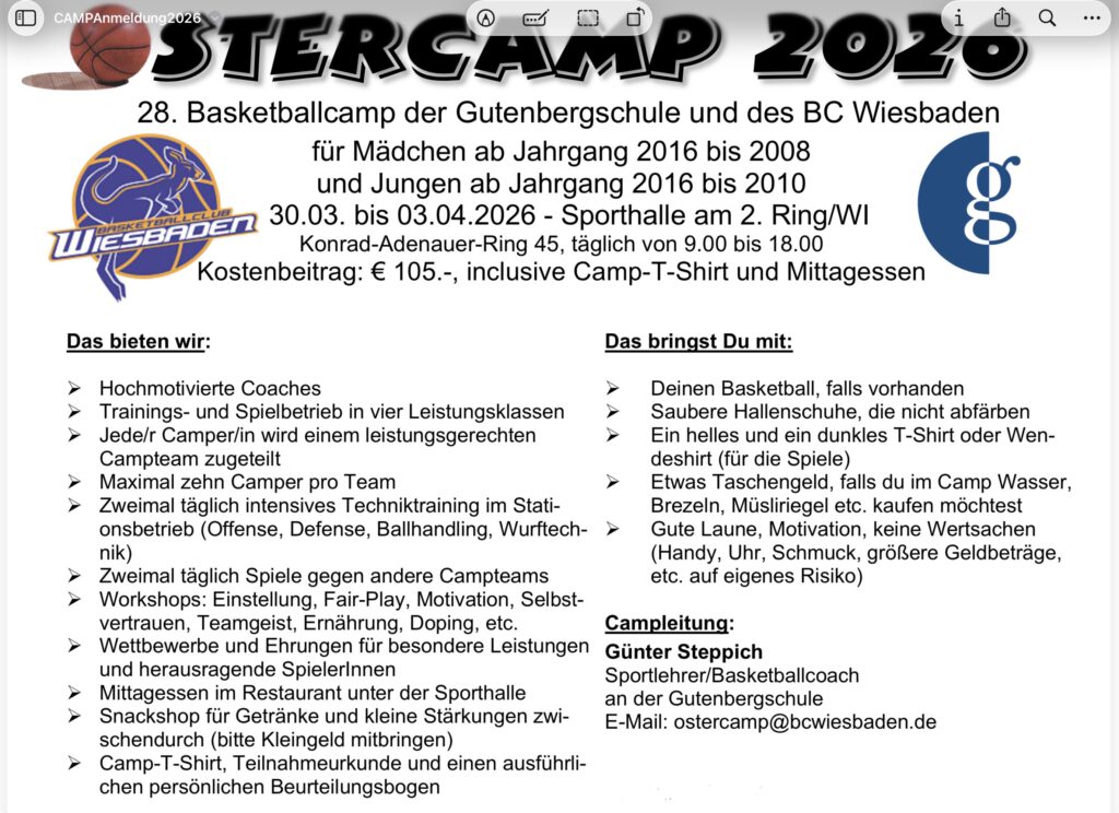 Anmeldeinformationen gibt es bei Herrn Steppich bzw. unter der angegeben Mailadresse. Aktuell sind nur noch 15 Plätze frei. Aufgrund der Erfahrungen der Vorjahre haben wir uns diesmal entschieden, ein Mindestalter einzuführen. Teilnehmen können Kinder ab Jahrgang 2016, besonders talentierte jüngere Kinder mit Vorerfahrungen aus einem Basketballverein nehmen wir nur auf Anfrage und mit Empfehlung eines/einer […]