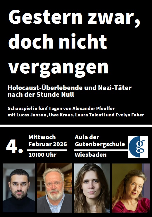 Am 4. Februar 2026 fand mit Bezug auf den Holocaust-Gedenktag am 27. Januar in der Aula der Gutenbergschule die szenische Lesung des Stücks ‚Gestern zwar, doch nicht vergangen‘ statt. Der Autor Alexander Pfeuffer und vier Schauspieler vom Staatstheater Wiesbaden gestalteten eine gelungene Lesung, die sich bedrückend realistisch mit dem Trauma von Opfern und mit der Schuld der Täter des nationalsozialistischen Unrechtsstaats auseinandersetzte: In den 1960er Jahren trifft die jüdische Shoah-Überlebende und Ärztin Gustl Stein in Buenos Aires auf den straffrei entkommenen Schreibtischtäter Horst Ehrmann, einen ehemaligen Beamten im Reichsverkehrsministerium, der als Patient von ihr behandelt werden will. Die Tochter der Ärztin erfährt endlich mehr über die Geschichte ihrer Familie und der Sohn des Beamten beginnt nach Jahren blinden Vertrauens, die Selbstgerechtigkeit und Lebenslügen des Vaters zu hinterfragen. Im Anschluss an die Lesung hatten die Schüler die Möglichkeit, Fragen an den Autor zu richten und machten hiervon engagiert Gebrauch. Diese Veranstaltung wurde dankenswerterweise durch den Förderverein der Gutenbergschule unterstützt.